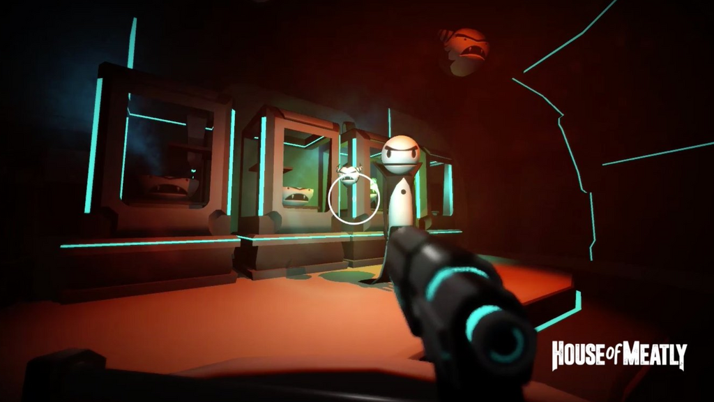 Unlike in Bendy and the Ink Machine, though, the player character in House of Meatly seems to have a gun in every screenshot, suggesting that combat might be a main aspect of gameplay. Each screenshot also has a large reticle in the middle, suggesting even further that combat might be important in House of Meatly. There’s combat in Bendy, but the game focuses more on puzzles and stealth, suggesting that this could be a major difference between the two titles.