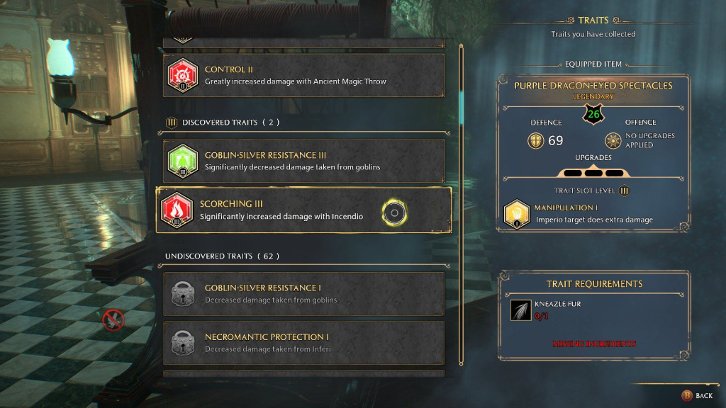 Trait provides passive bonuses like increased damage from Bombarda spells or decreased damage taken from spiders. Depending on your playstyle, equipping the right Traits can make you more powerful in combat, something that becomes increasingly important as you level up and faces tougher enemies.