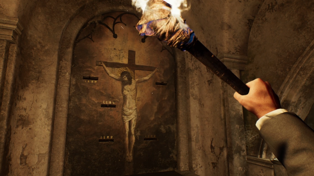 Look to the left of the crucifixion to spot a large statue that can be picked up and dropped somewhere else on the ground. This gives you access to a new bowl in front of the Holy Chalice mural, and pouring the wine in it will reveal the number II which will correspond to the lever for the right-side hand wound.