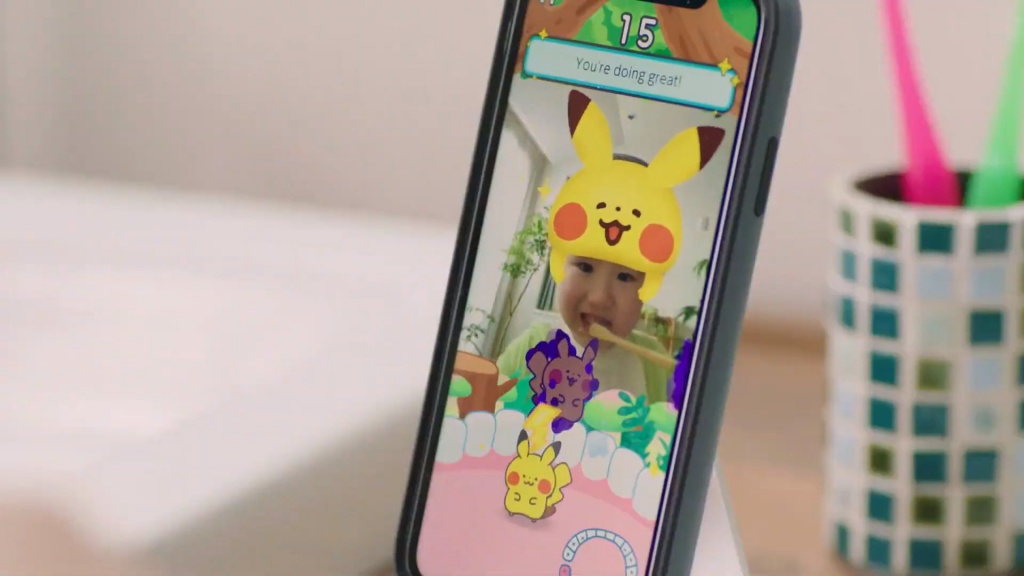 Judging by the trailer, the app uses the camera so when kids brush their teeth they’re catching Pokémon which pop up on screen – all in a unique art style.