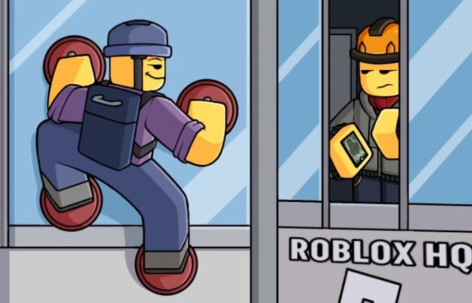 Once at the top, interact with the ball 10 times, but do not enter the metaverse portal. Instead, phase through a hidden wall to find a rooftop path leading to a giant Roblox HQ. Jump to the bottom ledge and begin your climb, dodging obstacles all the way.