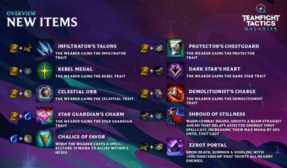 With a new Teamfight Tactics set comes new items. Galaxies introduces seven new spatula items to accompany the new space-themed classes and origins found in the autobattler’s third set.