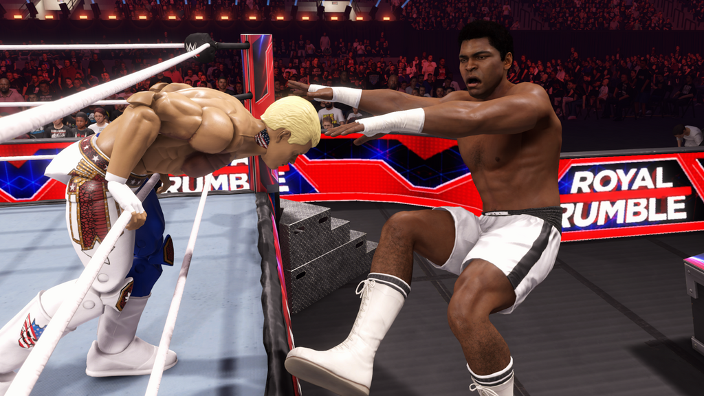 If your opponent is staggered against the ropes, either because of a strike or you dragging them into the ropes, you’ll have the option of hitting RT + A or R2 + X to hit your Royal Rumble Finisher. This varies from superstar to superstar and can be checked at any time in Move-Set from the Creation Suite, but in all cases it’s the opportunity for an almost guaranteed elimination.
